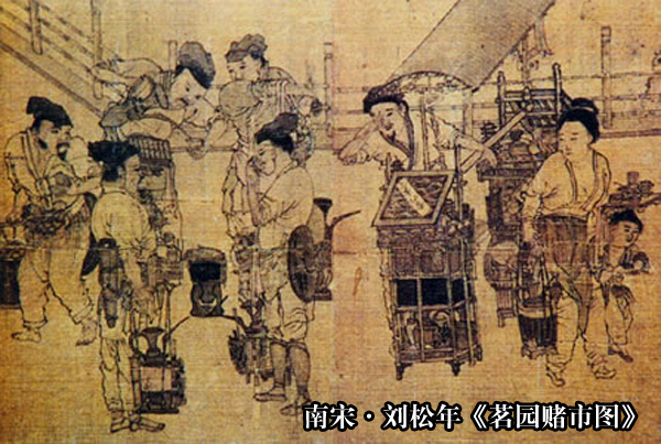 末茶點(diǎn)飲法是宋代主導的飲茶方式,點(diǎn)茶是宋代的主流茶藝,在此基礎上,出現了為品鑒茶葉品質(zhì)高下的斗茶,以及茶藝高手和文人雅玩的分茶。點(diǎn)茶,因以瓶滴注為點(diǎn),故名。宋代胡仔《苕溪漁隱叢話(huà)》前集卷四十六引《學(xué)林新編》:“茶之佳品,皆點(diǎn)啜之,其煎啜之者,皆常品也?!辈滔濉恫桎洝c(diǎn)茶》:“鈔茶一錢(qián)七,先注湯,調令極勻;又添注入,環(huán)回擊拂,湯上盞可四分則止。"點(diǎn)茶盛行于宋代,故有“唐煮宋點(diǎn)”之說(shuō)。點(diǎn)茶用餅茶或者散茶研磨成的末茶,茶器有茶焙、茶籠、砧榷、茶鈐、茶碾、茶羅、茶盞、茶匙/茶筅、湯瓶等。點(diǎn)茶技藝有炙茶(烤干水氣)、碾茶(茶塊碾成粉面)、羅茶(用絹羅篩茶)、候湯(選水和燒水)、憎盞(用開(kāi)水沖洗茶盞)和點(diǎn)茶(沸水沖泡)等基本過(guò)程。